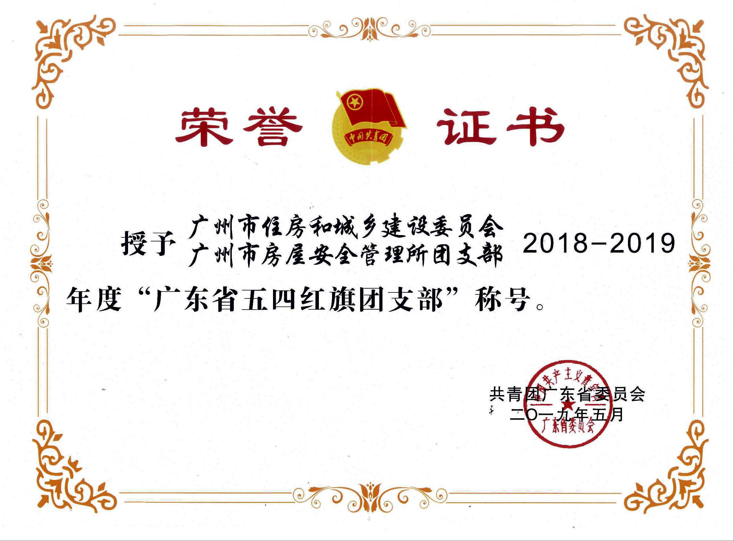 在世界杯压球官方网站团委和市房屋安全管理所党委的正确领导和亲切关怀下,市房屋安全管理所团支部紧扣学习宣传贯彻党的十九大精神这条主线,围绕中心、服务大局,团结带领广大青年勇当推动广东经济社会发展的生力军和突击队,各方面工作取得了新的成绩,并受到了上级的高度肯定,荣获2018-2019年度“广东省五四红旗团支部”称号。