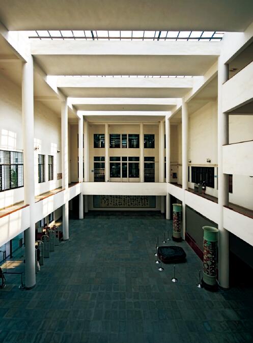 图书馆设计流线明确,公共与私密空间分明;利用两中庭采天光,使厚重的图书馆室内空间依然明亮,有利于学习阅读,并带进穿堂风,从天井排出热气。主入口宽阔的台阶引导人流到二楼,营造典雅庄重的气质和步入学术殿堂的感受。