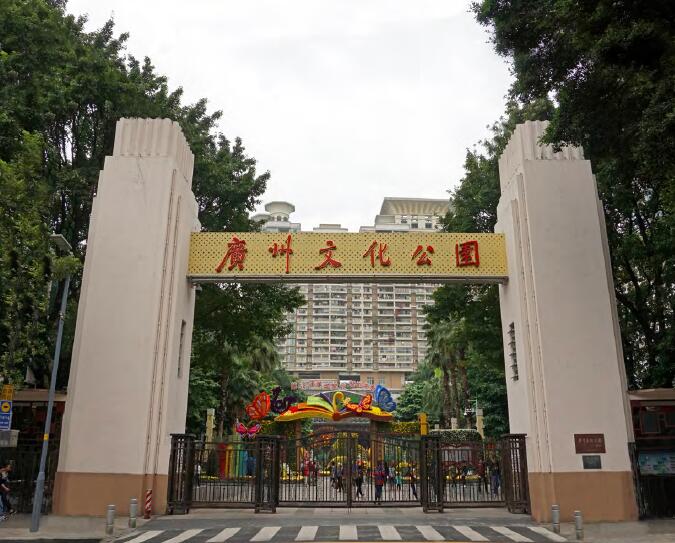 华南土特产展览交流大会旧址门楼位于荔湾区西堤二马路37号文化公园门楼,建于1951年,建筑师为林克明先生,高1层,砖混结构,坐北朝南。