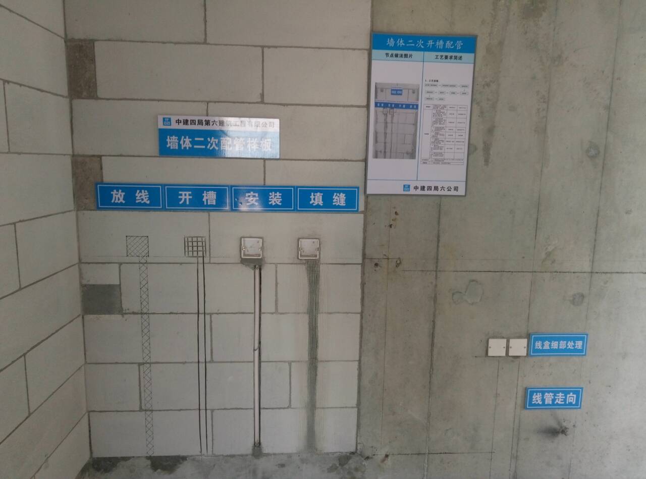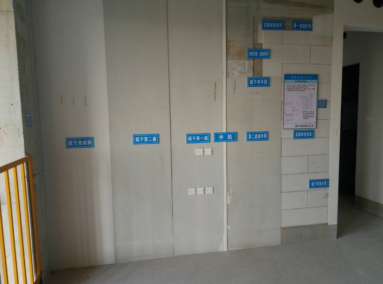 实体样板区域位于珠江金茂府8号楼7层,面积为633㎡,分别分为D3、D2左单元、D2右单元、D1左单元和D1右单元。其中D3和D2户型主要展示结构样板,主要内容为:砼结构实测实量技术操作指引、墨线工程、混凝土及线管成品保护、楼梯成品保护、洞口防护、铝模合金模板深化内容、成品烟道及铸铁排水管;D1户型主要展示免抹灰高精砖砌体样板,主要内容为:砌体实测实量技术操纵指引、涂饰工程实测实量技术操作指引、免抹灰高精砖砌体工艺、、刮腻子施工工艺、卫生间防水施工工艺、保温砂浆施工工艺、线管安装工艺、线盒细部处理、构造柱绑扎及支模加固、不同材质内挂网和反坎凿毛及支模加固。