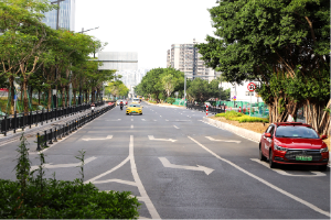 兴科路、华观路西延线围绕华南国家植物园展开,从畅达性、易达性、舒适性出发,构建“三门六廊,三路六节点”的交通体系。改造后的道路软硬质材料结合,为市民提供更便捷的人行交通,同时整体铺装风格统一,与周边环境协调。
