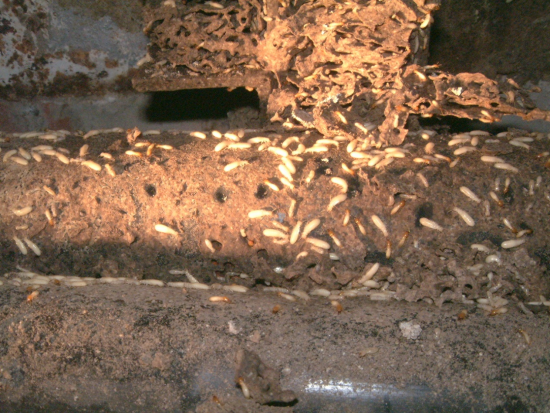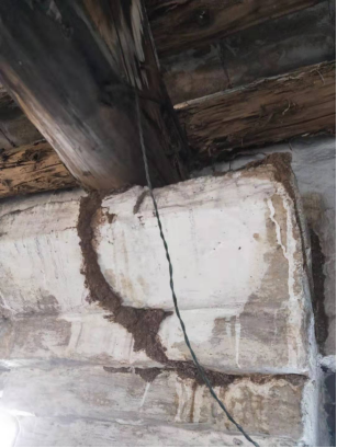 3.蔓延:建筑物地下、外围绿化树木等外部环境存在白蚁巢,白蚁通过修筑蚁路进入建筑物内部为害,是白蚁入侵建筑物的主要途径。