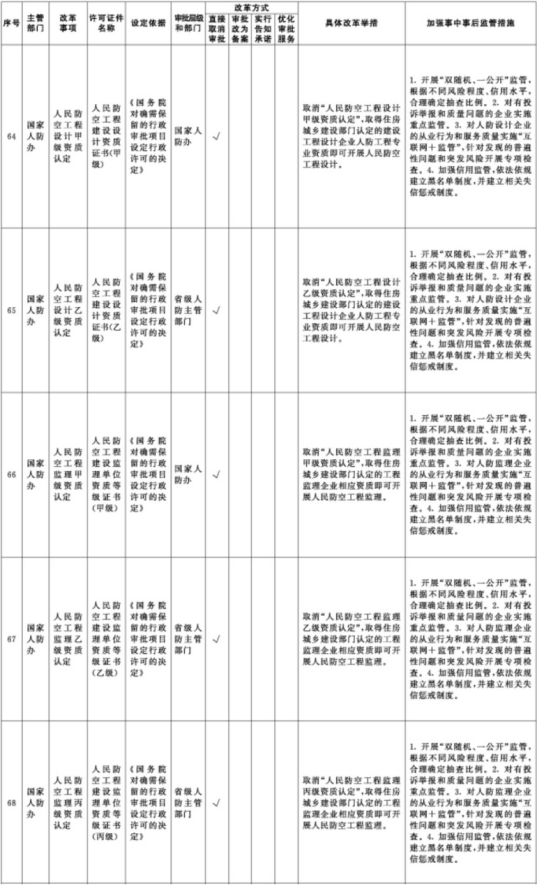 (一)直接取消审批。为在外资外贸、工程建设、交通物流、中介服务等领域破解“准入不准营”问题,在全国范围内取消68项涉企经营许可事项,在自由贸易试验区试点取消14项涉企经营许可事项。取消审批后,企业(含个体工商户、农民专业合作社,下同)取得营业执照即可开展经营,行政机关、企事业单位、行业组织等不得要求企业提供相关行政许可证件。