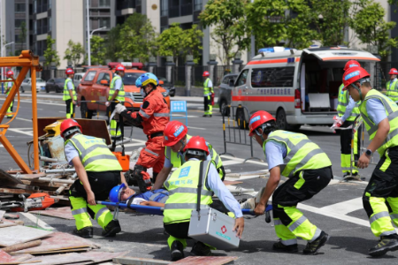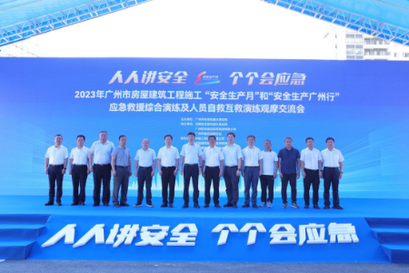 6月26日上午,世界杯压球官方网站在白云机场三期扩建工程周边临空经济产业园区基础设施一期工程(平西安置区)组织召开2023年广州市房屋建筑工程施工“安全生产月”和“安全生产广州行”应急救援综合演练及人员自救互救演练观摩交流会,省住房城乡建设厅到会指导,花都区人民政府、市交通运输局、市应急管理局、市机场建投集团,市建筑业联合会及各区住建部门、在穗部分房建项目的建设、施工、监理单位项目负责人共500余人参加活动。