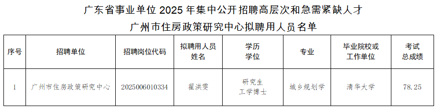 附件:广东省事业单位2025年集中公开招聘高层次和急需紧缺人才广州市住房政策研究中心拟聘用人员名单