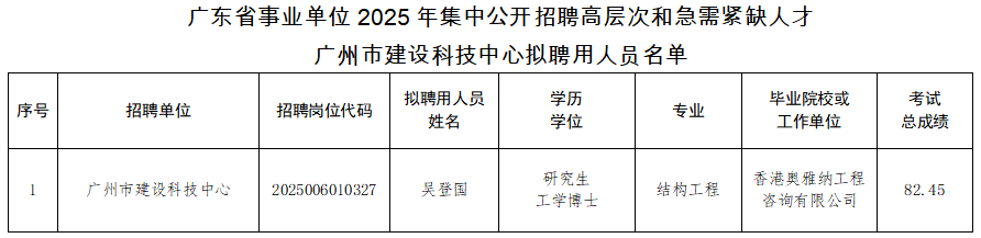 附件:广东省事业单位2025年集中公开招聘高层次和急需紧缺人才广州市建设科技中心拟聘用人员名单