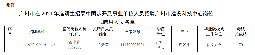附件:广州市在2023年选调生招录中同步开展事业单位人员招聘广州市建设科技中心岗位拟聘用人员名单