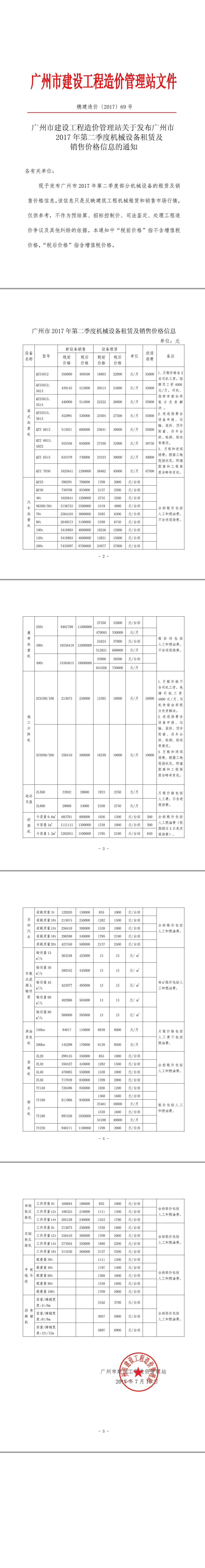 【机械设备租赁】关于发布广州市2017年第二季度机械设备租赁及销售价格信息的通知