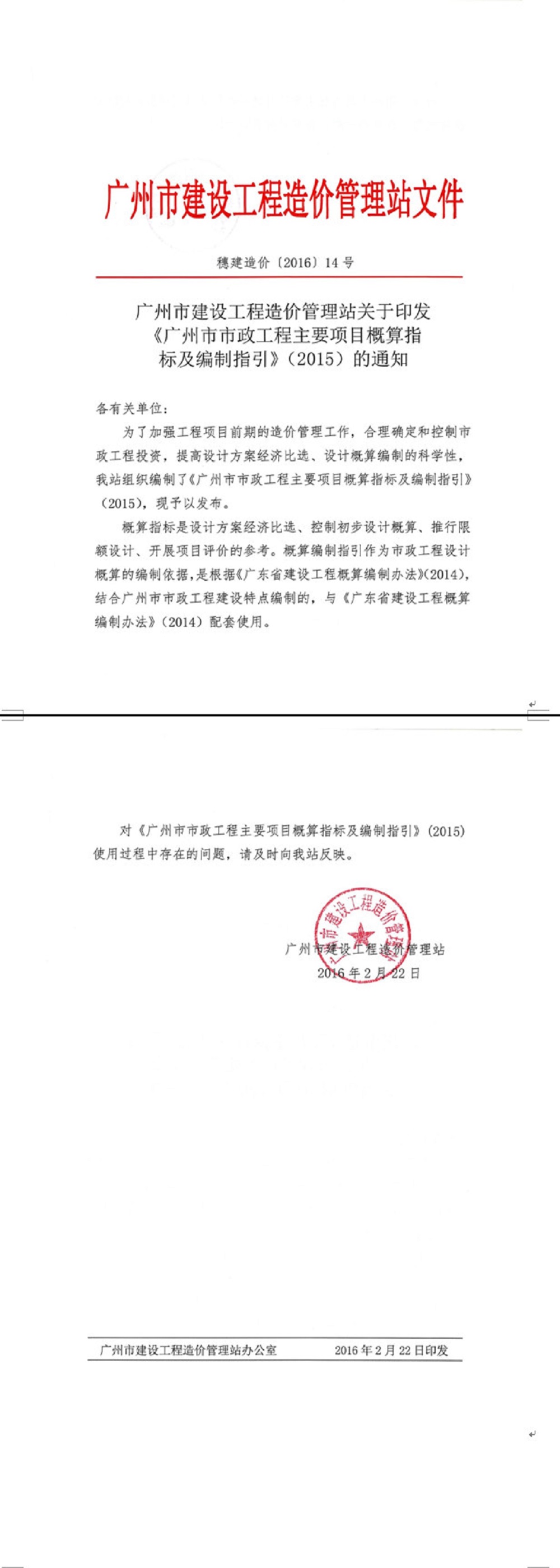 【计价文件】关于印发《广州市市政工程主要项目概算指标及编制指引》(2015)的通知