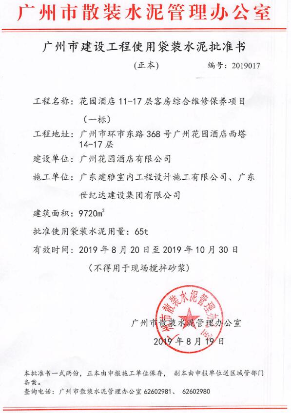 广州市建设工程使用袋装水泥批准书(花园酒店14-17层客房综合维修保养项目)