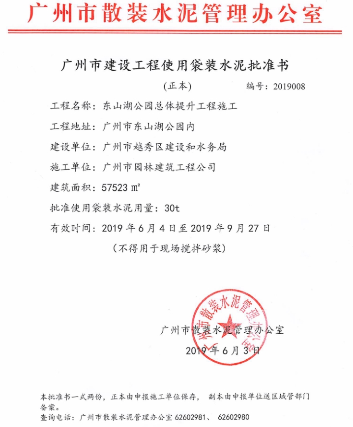 广州市建设工程使用袋装水泥批准书(东山湖公园总体提升工程施工)