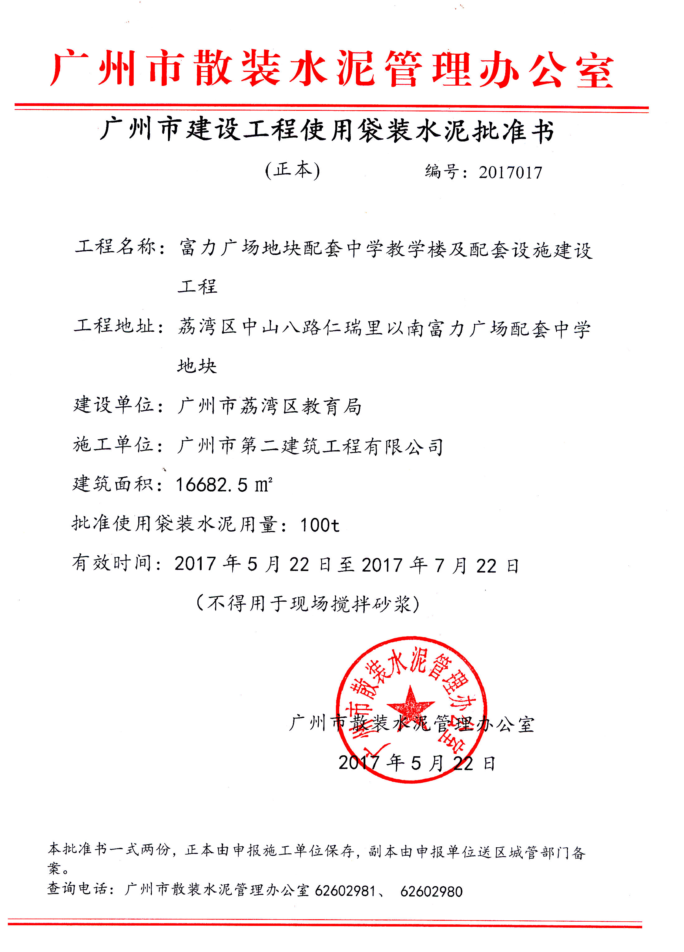 广州市建设工程使用袋装水泥批准书(富力广场配套中学教学楼工程)
