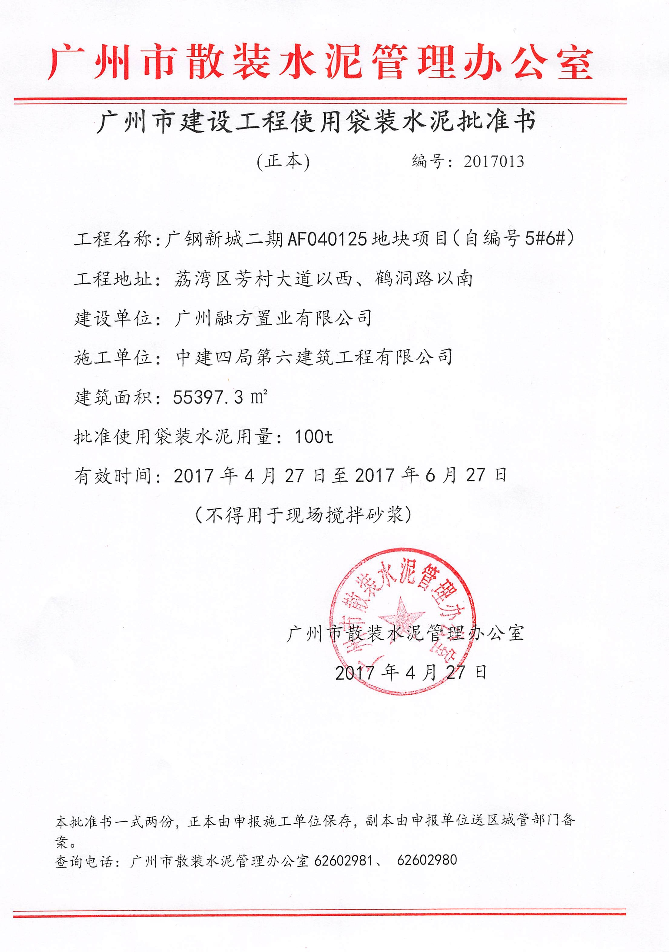 广州市建设工程使用袋装水泥批准书(广钢新城二期AF040125地块项目(5#6#))