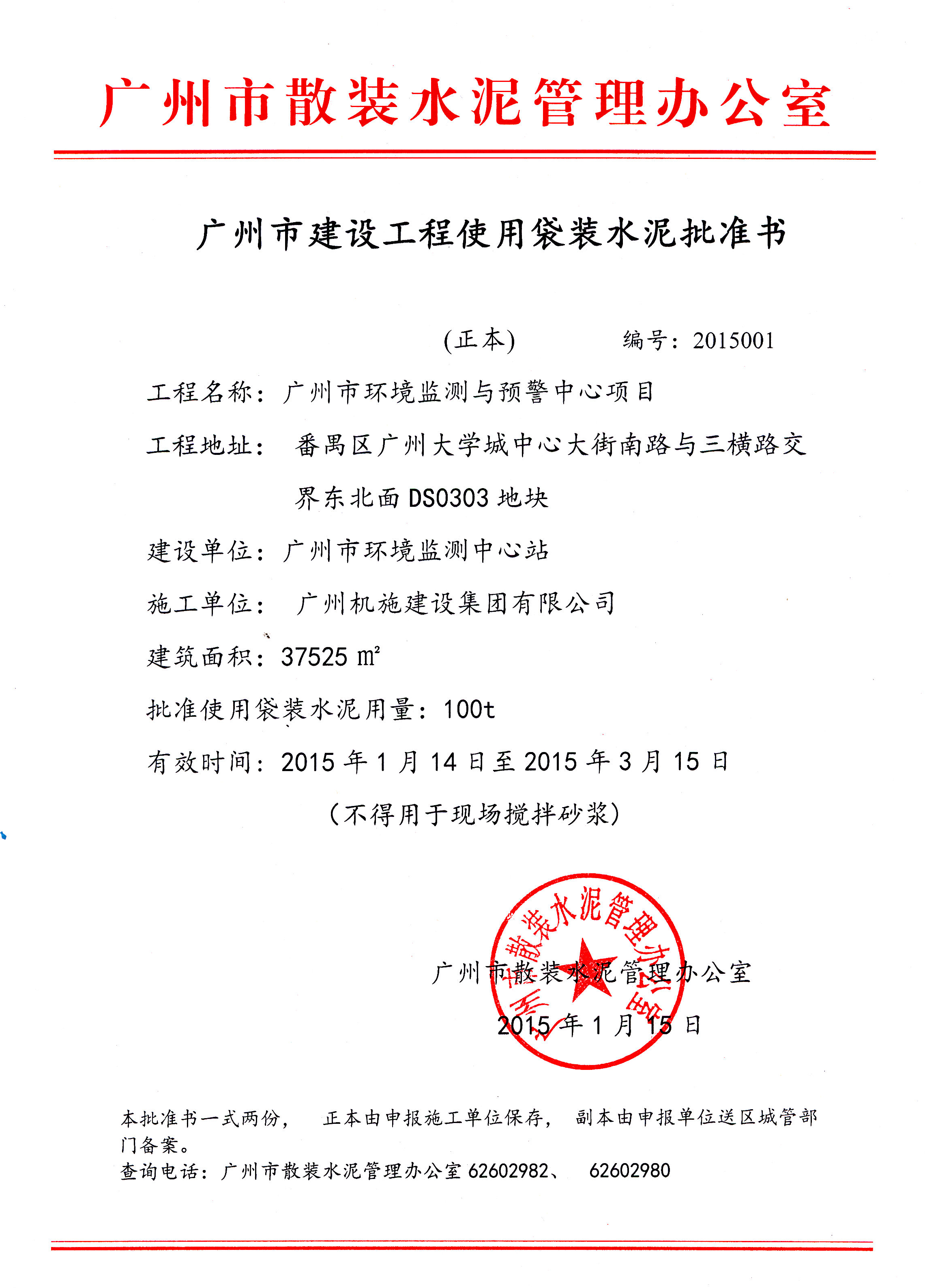 广州市建设工程使用袋装水泥批准书(广州市环境监测与预警中心项目)