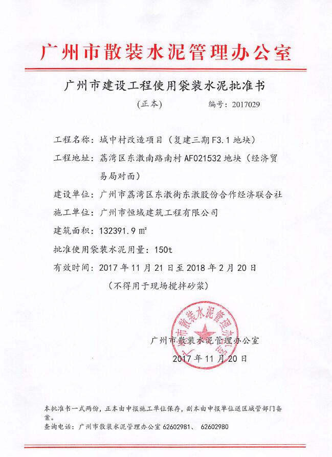 广州市建设工程使用袋装水泥批准书(城中村改造项目)