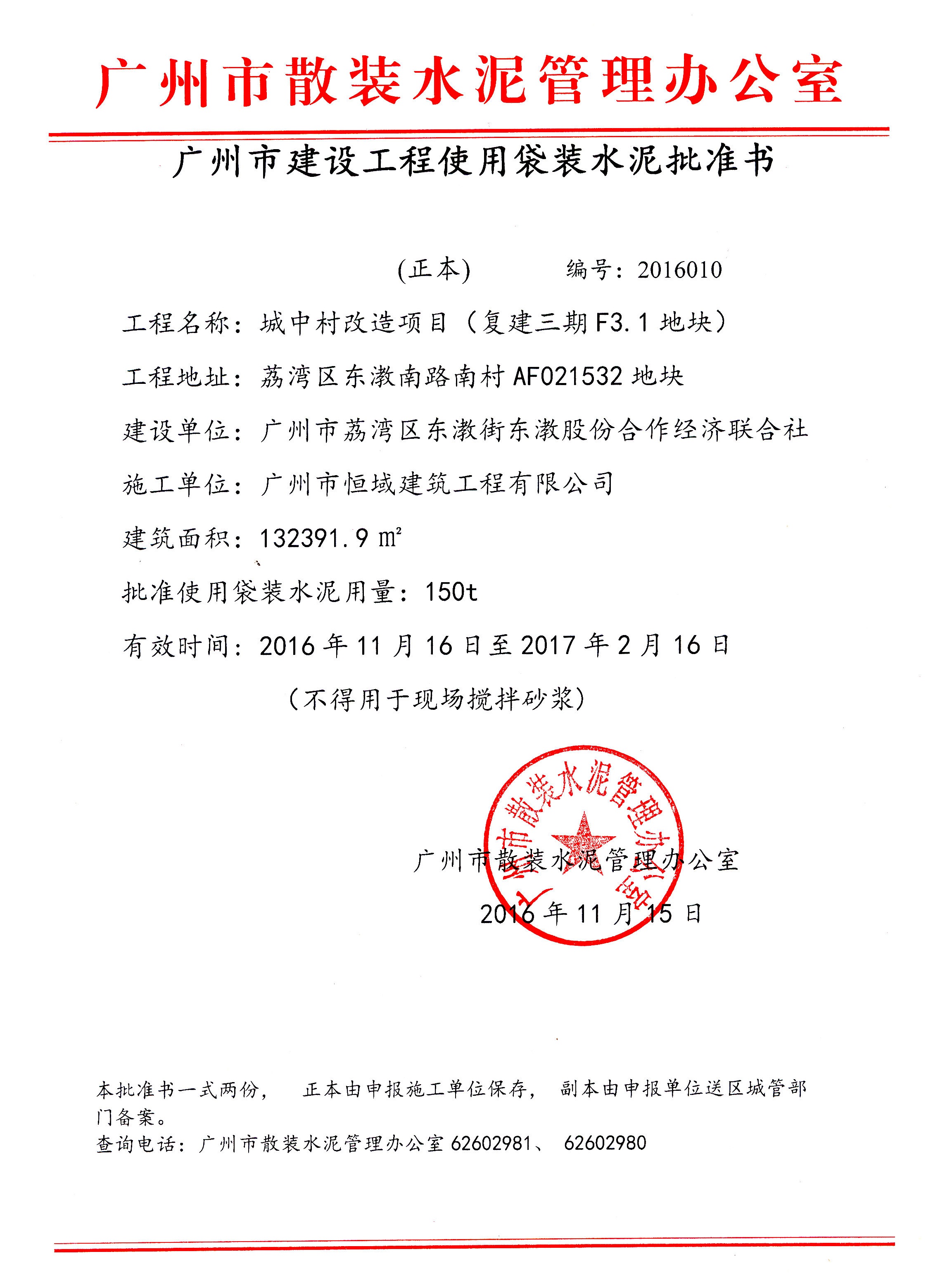 广州市建设工程使用袋装水泥批准书(城中村改造项目复建三期F3.1地块-编号2016010)