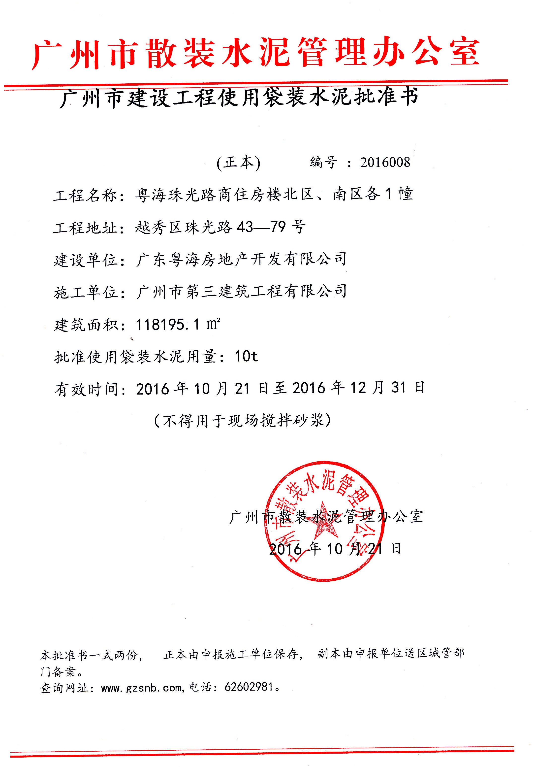 广州市建设工程使用袋装水泥批准书(粤海珠光路商住房楼北区、南区各1幢)