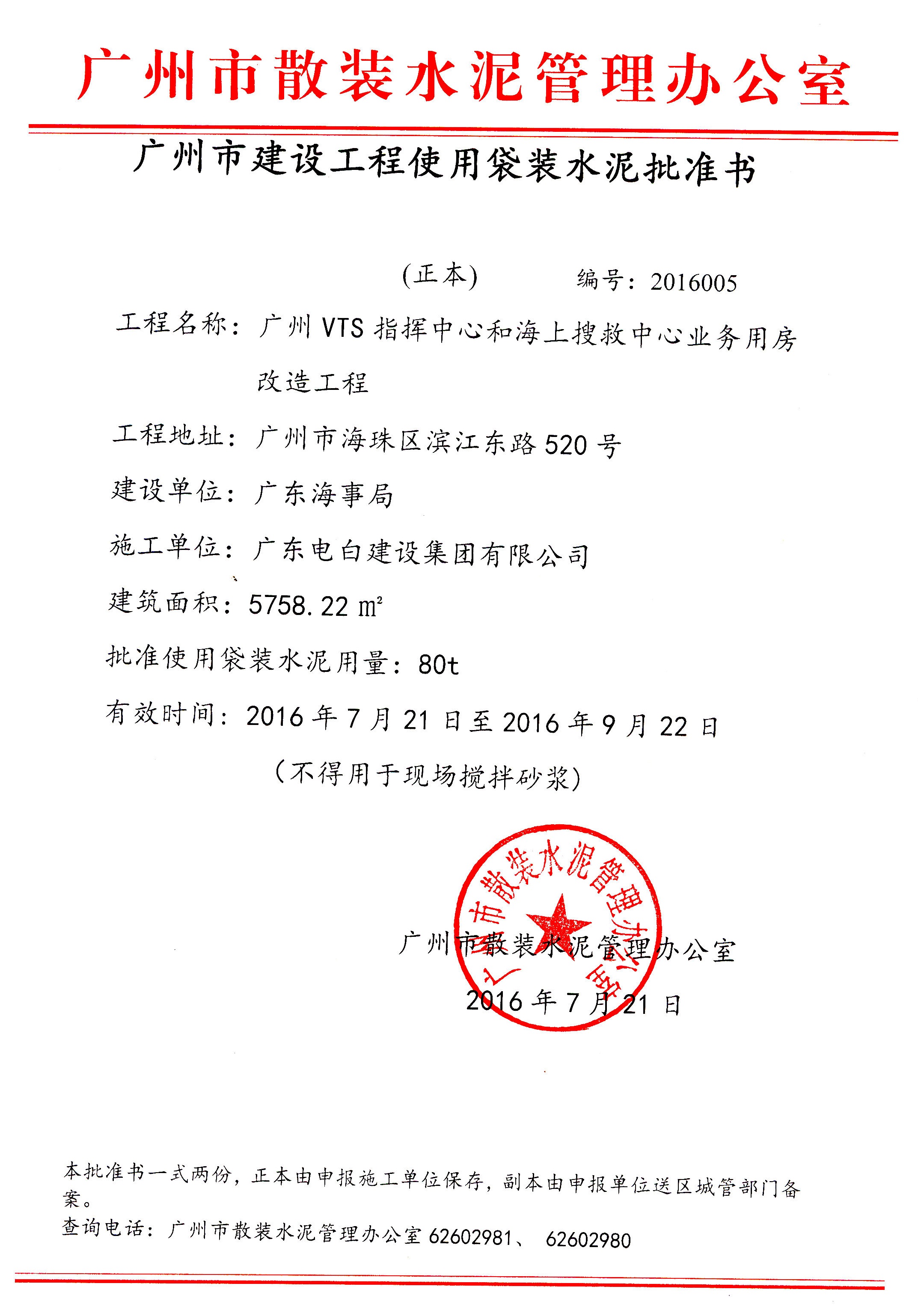 广州市建设工程使用袋装水泥批准书(广州VTS指挥中心和海上搜救中心业务用房改造工程)