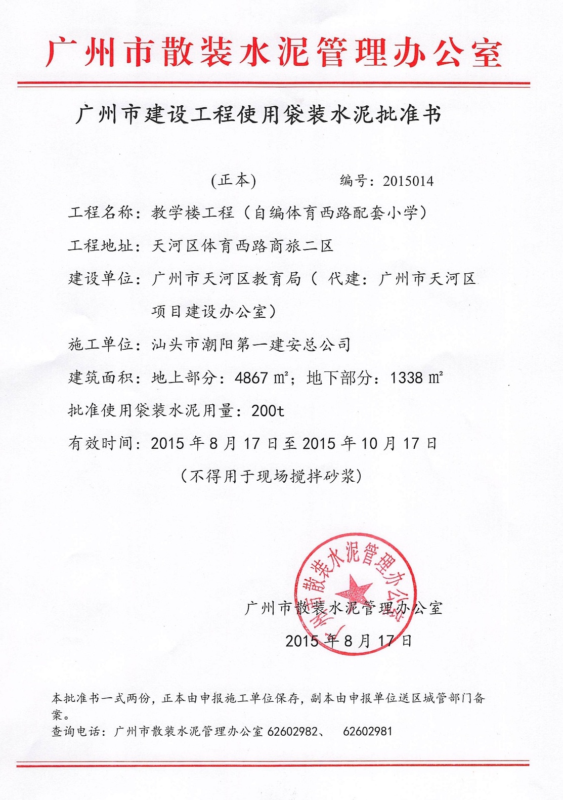广州市建设工程使用袋装水泥批准书(体育西路配套小学教学楼工程)