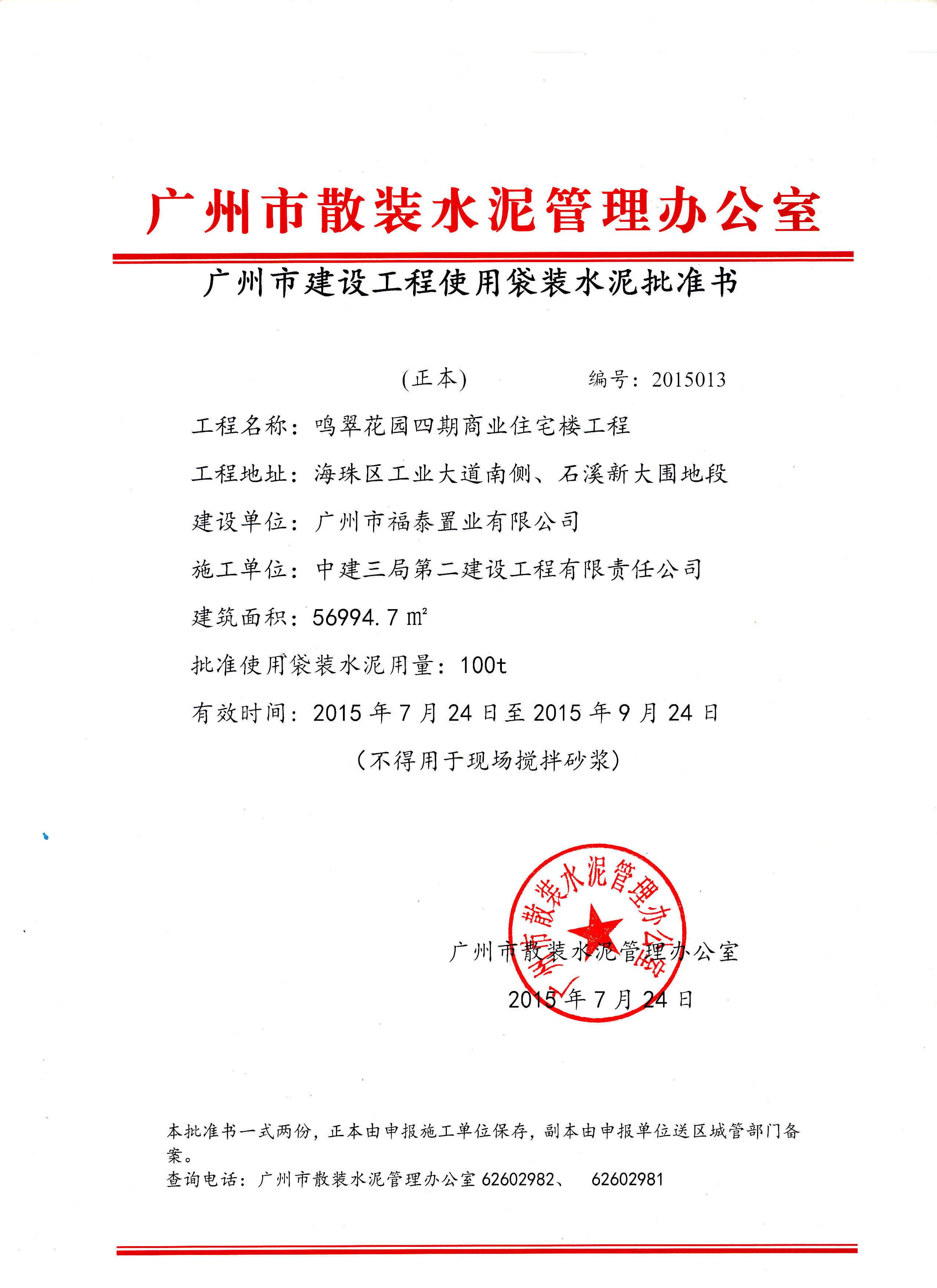 广州市建设工程使用袋装水泥批准书(鸣翠花园四期工程)