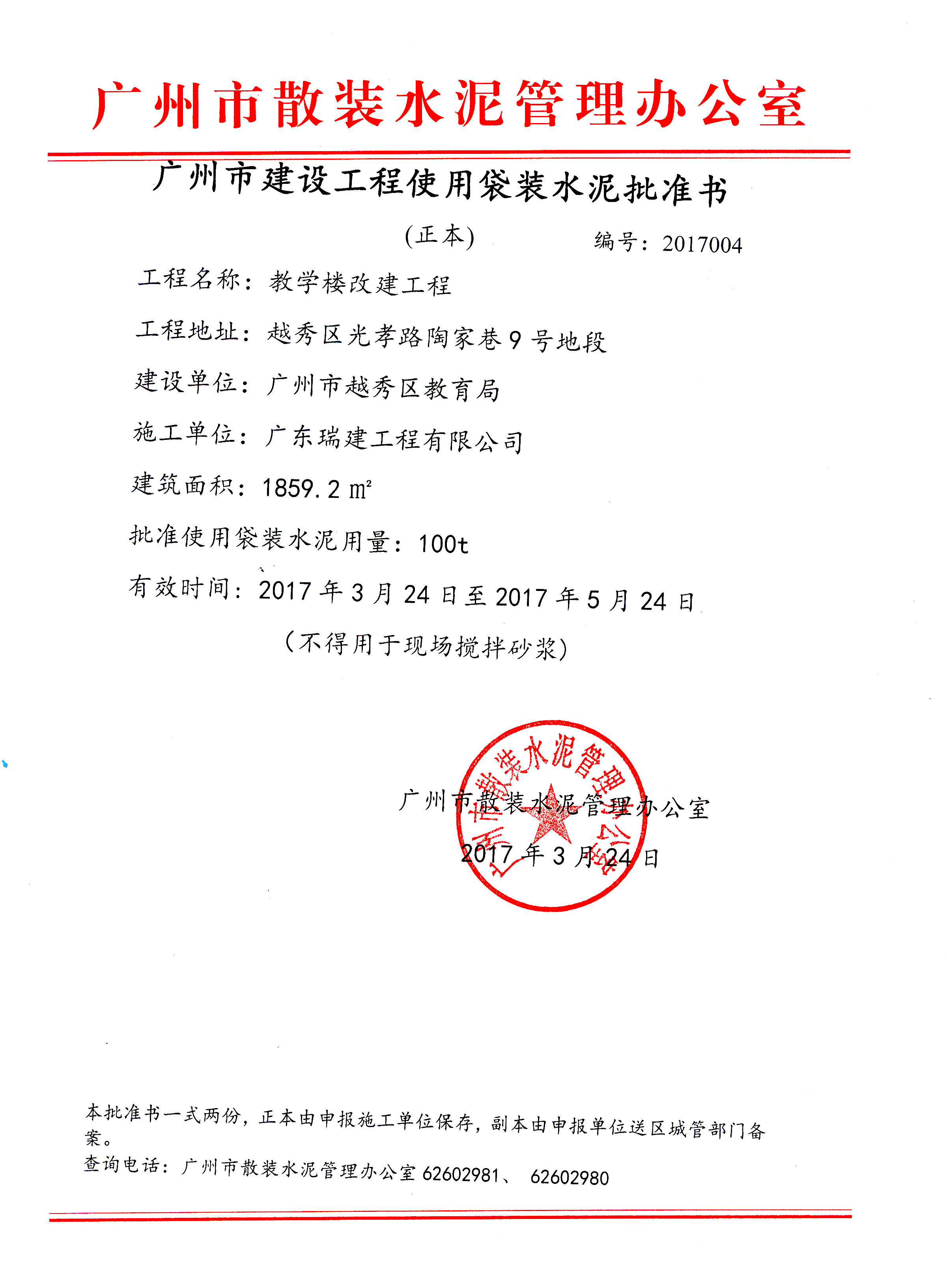 广州市建设工程使用袋装水泥批准书(光孝路陶家巷9号地段教学楼改建工程)