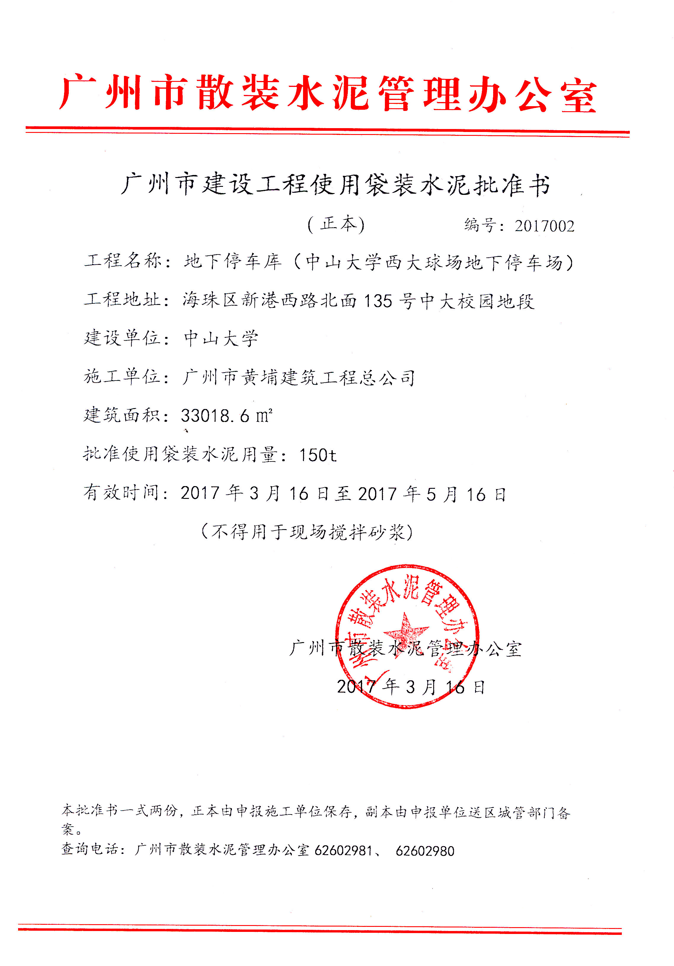 广州市建设工程使用袋装水泥批准书(中山大学西大球场地下停车场)