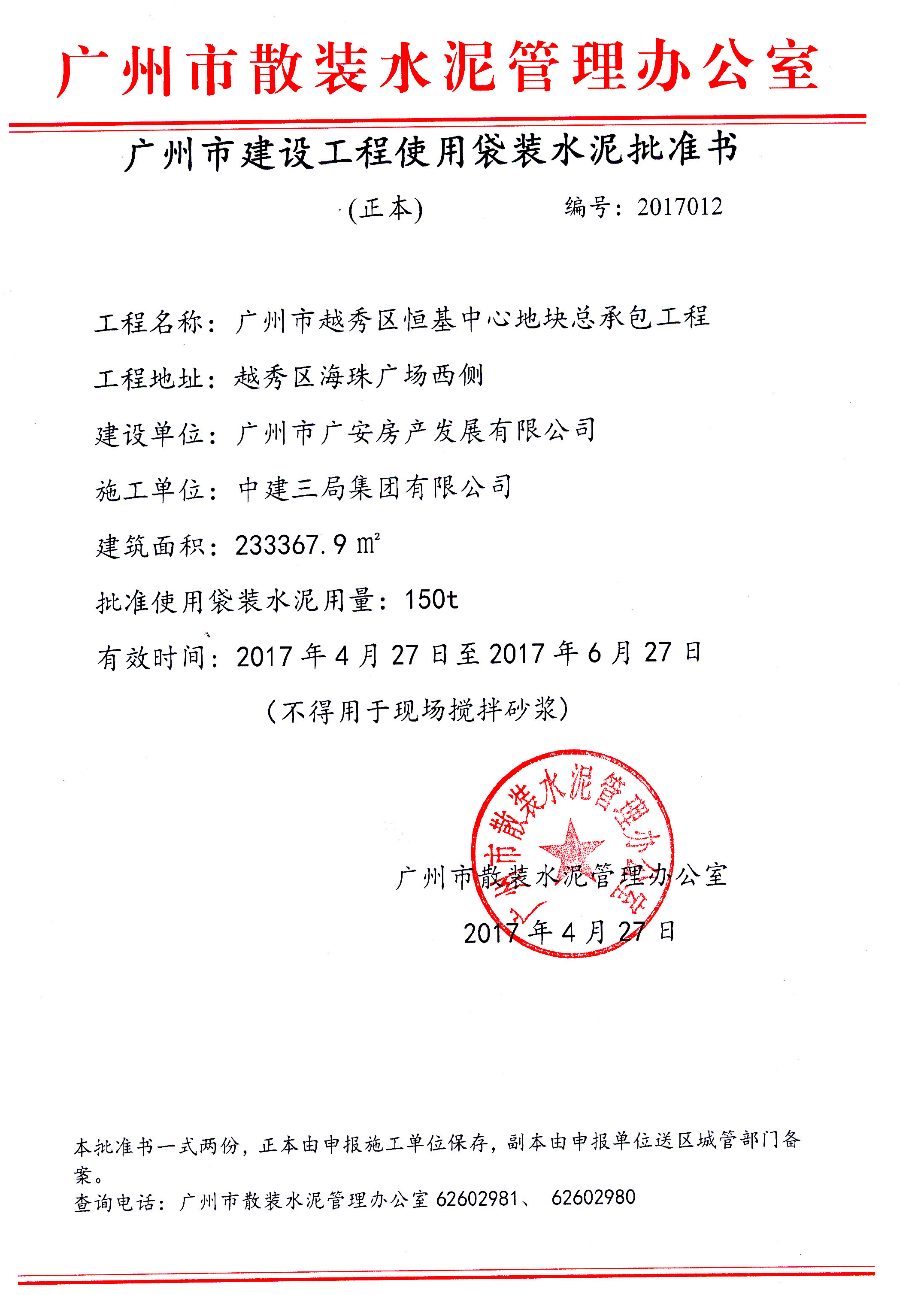 广州市建设工程使用袋装水泥批准书(越秀区恒基中心地块总承包工程)