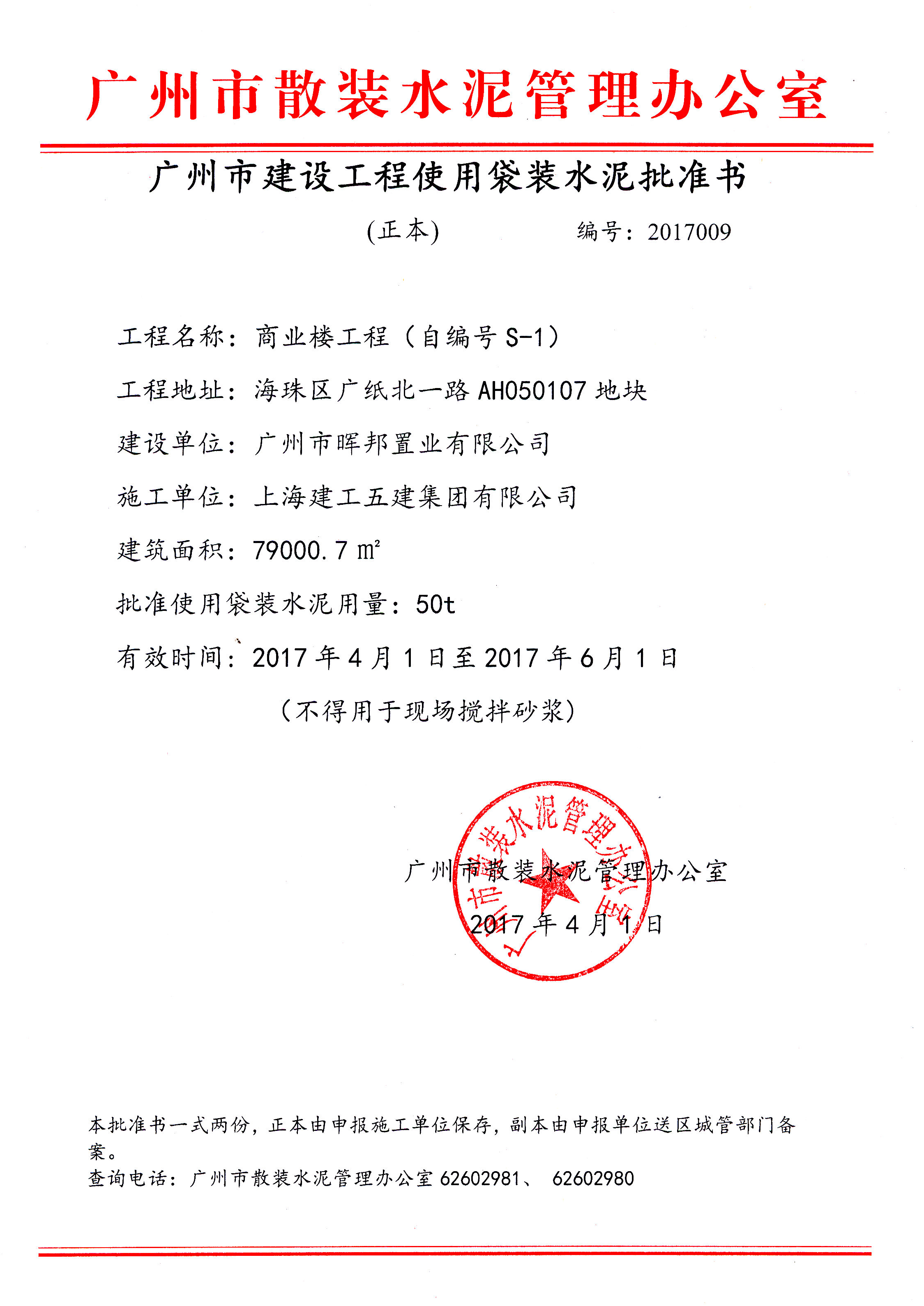 广州市建设工程使用袋装水泥批准书(广纸北一路AH050107地块商业楼工程(自编号S-1))