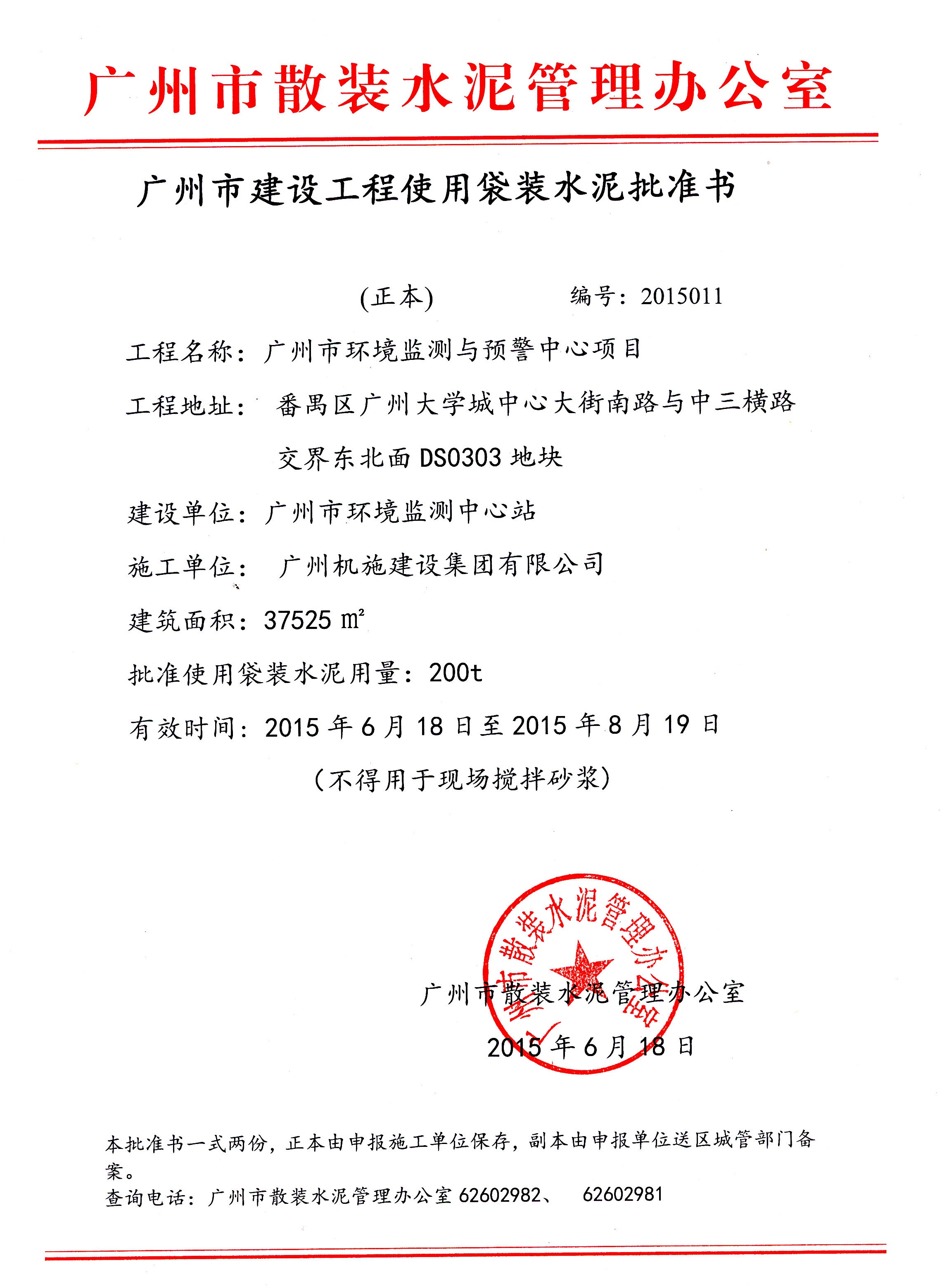 广州市建设工程使用袋装水泥批准书(广州市环境监测中心站项目)