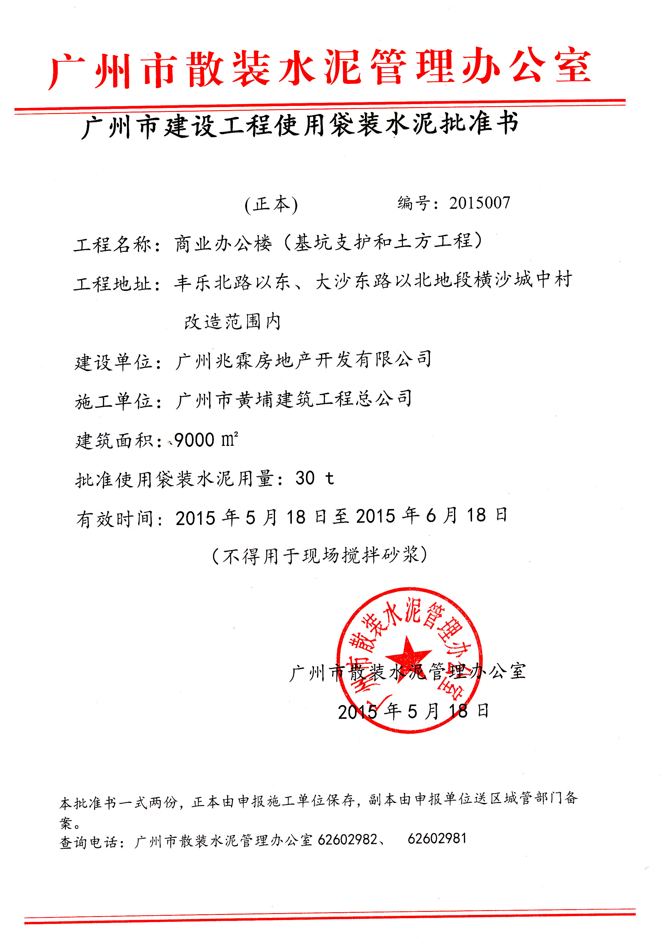 广州市建设工程使用袋装水泥批准书(横沙城中村商业办公楼基坑支护和土方工程)